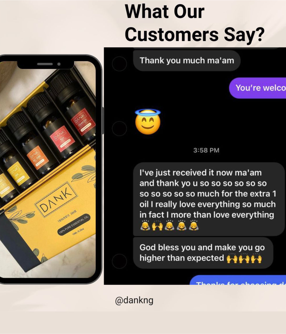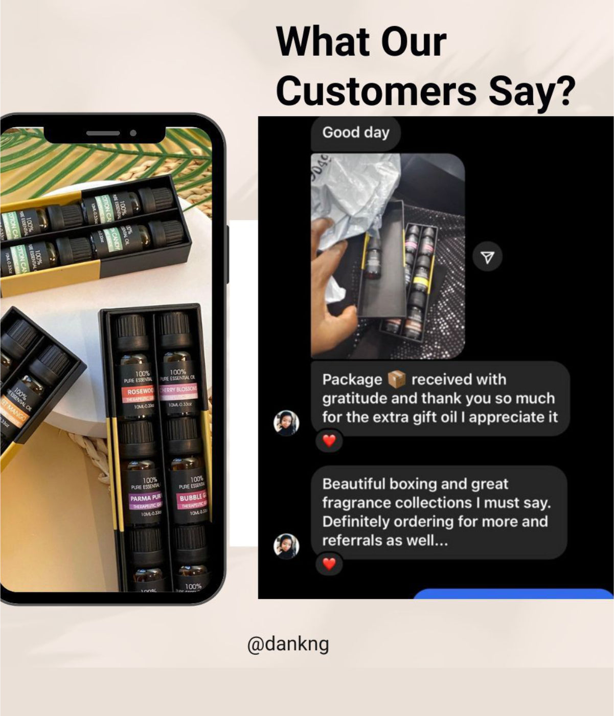 "Package received with gratitude and thank you so much for the extra gift oil. Beautiful boxing and great collections I must say. Definitely ordering for more and referrals as well"